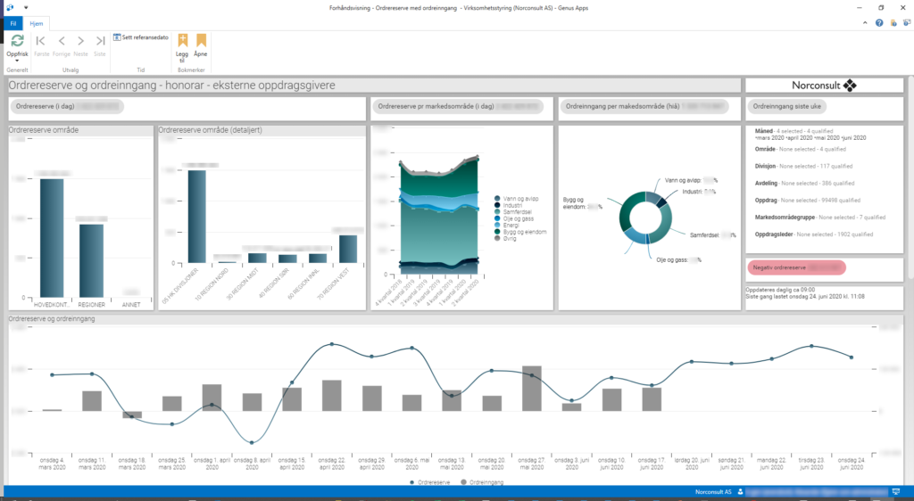 Corporate management dashboard showing backlog, project status and financial results vs. budgets for Norconsult Norway.