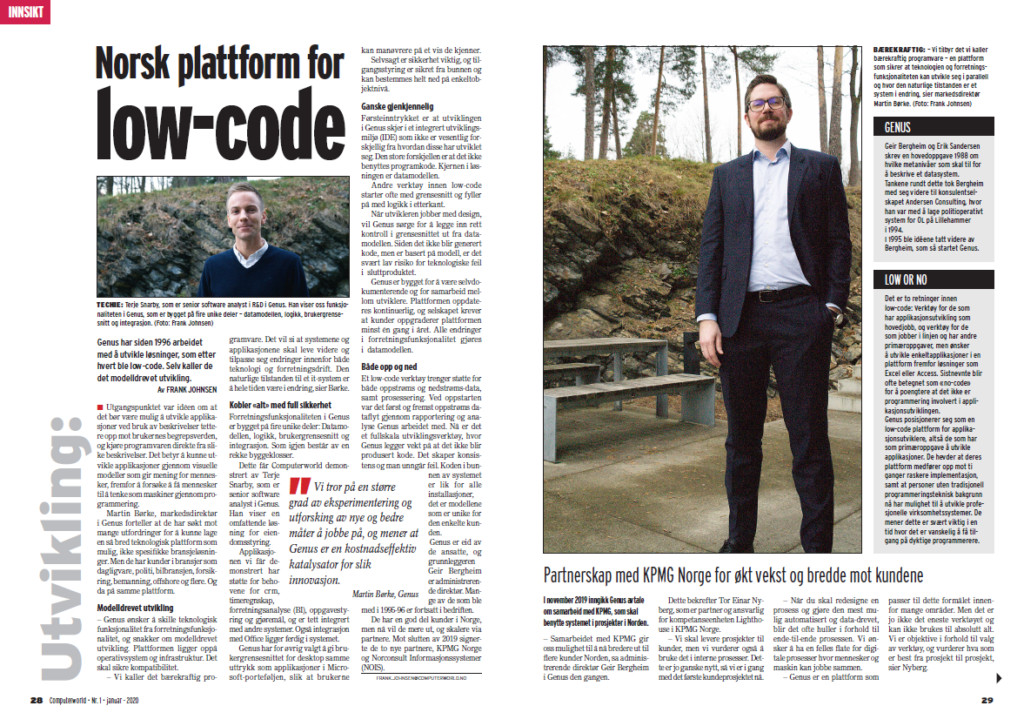 Low-code development continues to attract public interest. In this month’s edition of the Norwegian IT magazine Computerworld, you can read interviews with Genus, KPMG and John Rymer from Forrester in the Insights section about low-code development.